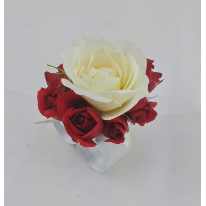 A pretty little mix of a white rose surrounded by tiny red rose buds on a silver diamante bracelet